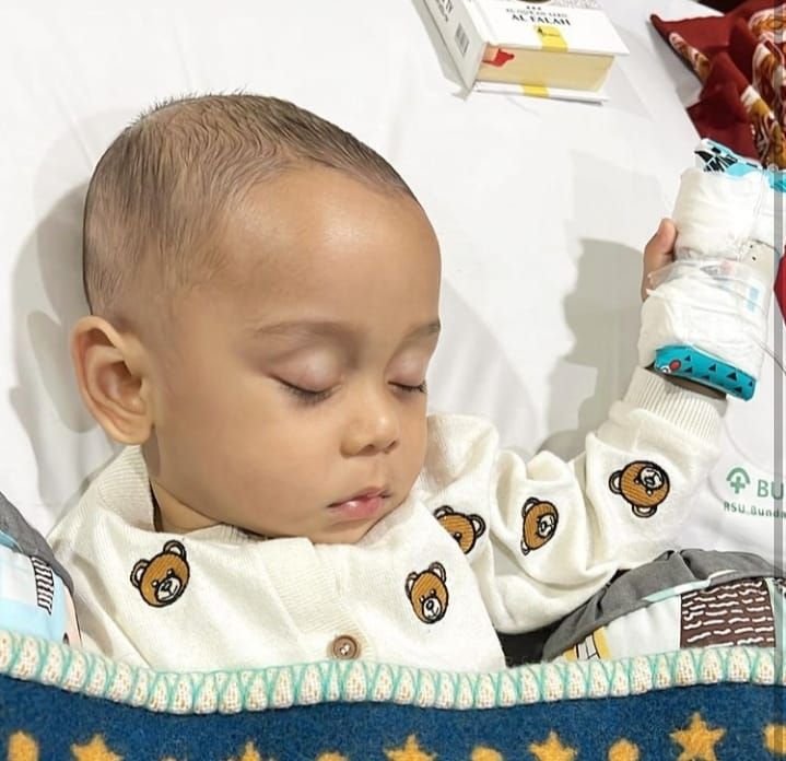 Dalam foto yang diunggah Rizky Billar, tampak Baby L terlelap tidur dengan tangan diikat selang infus. Sedangkan pada bagian slide foto kedua, Baby L tampak duduk dengan tatapan wajah polos.