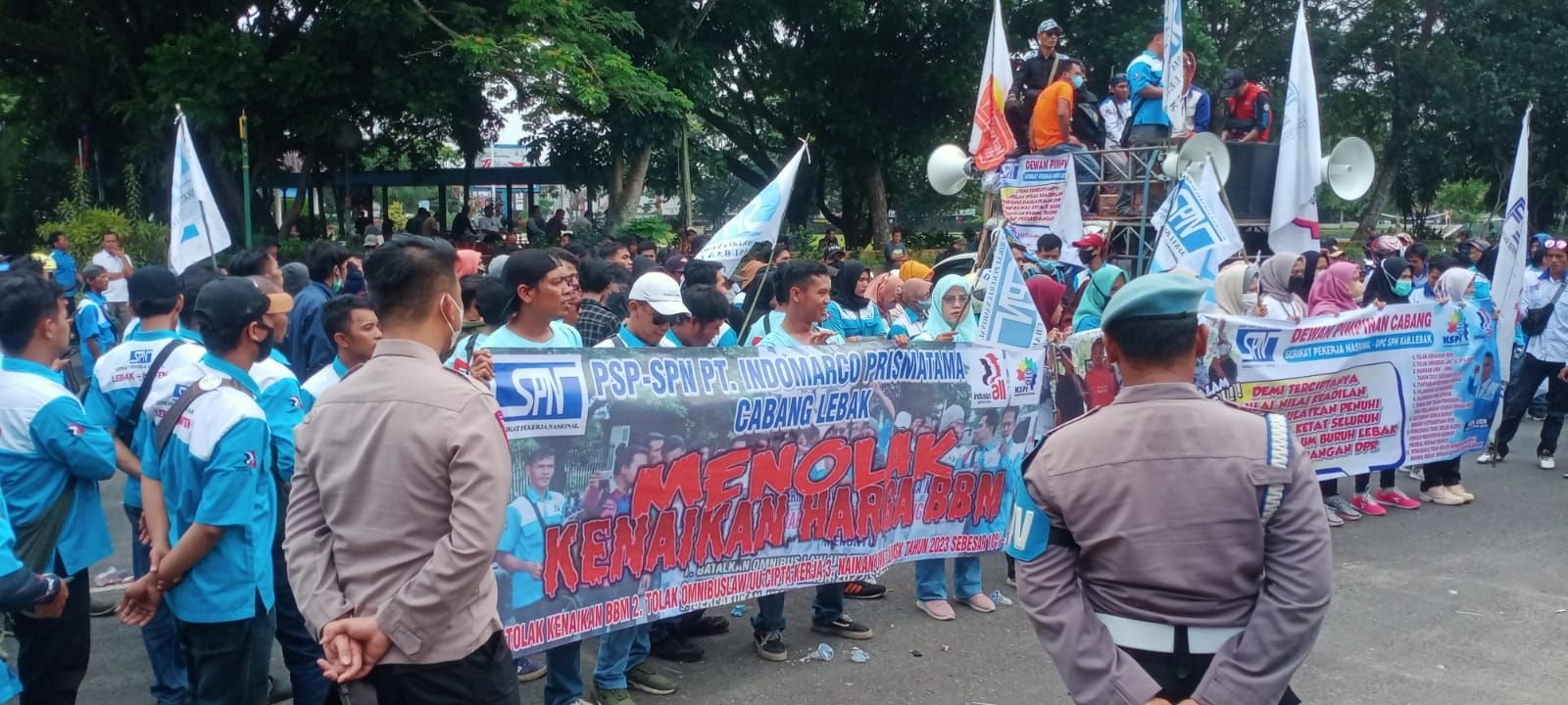 BANTEN RAYA.COM- Ratusan Buruh yang tergabung dalam Serikat Pekerja Nasional menggelar Demo di Depan Gedung DPRD Kabupaten Lebak.