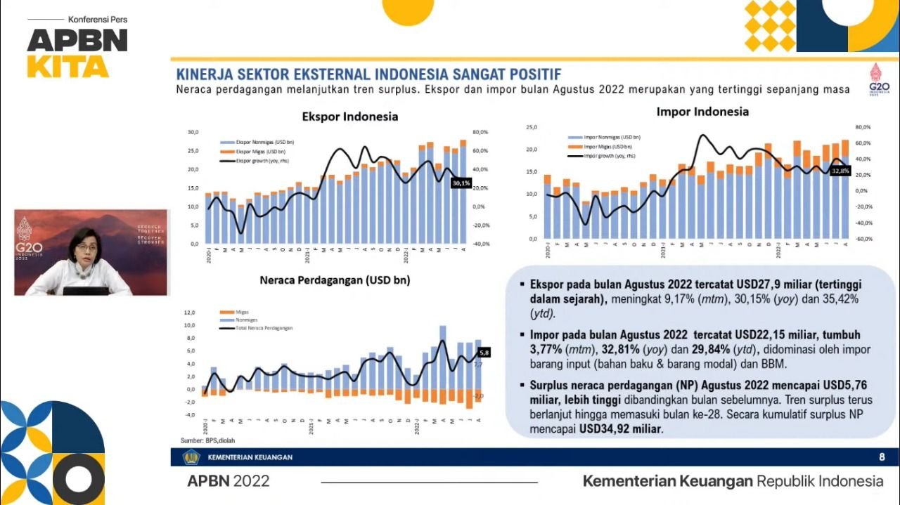Dikutip BantenRaya.Com dari Youtube Menkeu RI pada Selasa 27 September 2022, Menteri Keuangan Sri Mulyani mengatakan, Indonesia harus terus menjaga momentum positif tren neraca perdagangan. Untuk itu harus menjaga nilai ekspor.