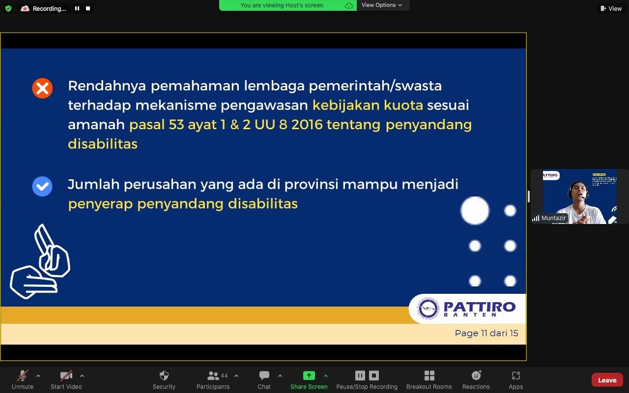 “Dari 3 kabupaten/ kota yang sudah punya perda itu, baru Kota Serang yang memiliki Peraturan Walikota sebagai acuan teknisnya,” ujar Mumu, sapaan akrab Muntazir, saat diskusi publik yang diadakan PATTIRO Banten dengan tema Urgensi Perlindungan dan Pemenuhan Hak Pelayanan Dasar Bagi Penyandang Disabilitas di Banten yang dilakukan secara daring, Kamis, 29 September 2022.