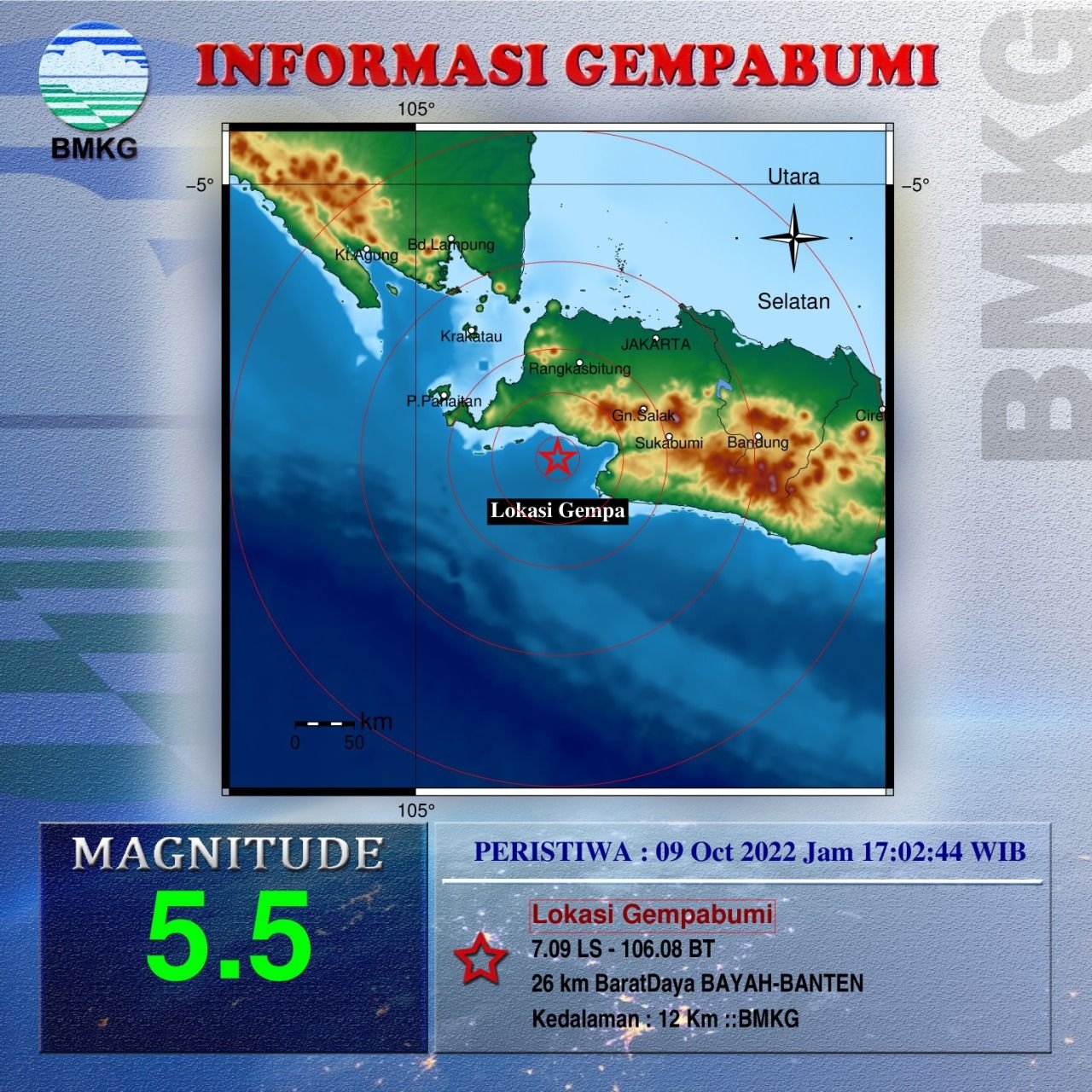 BANTENRAYA.COM – BMKG mencatat telah terjadi gempa bumi dengan kekuatan 5,5 magnitudo, Minggu 9 Oktober 2022.