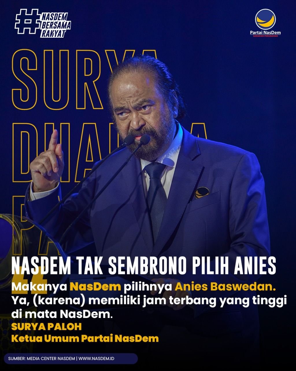 “NasDem tak sembrono memilih Anies Baswedan sebagai capres 2024. Hal tersebut ditegaskan langsung oleh Ketua Umum Partai NasDem Surya Paloh,” tulis Partai Nasdem melalui akun Twitter resminya @NasDem dikutip Bantenraya.com, Sabtu, 22 Oktober 2022.
