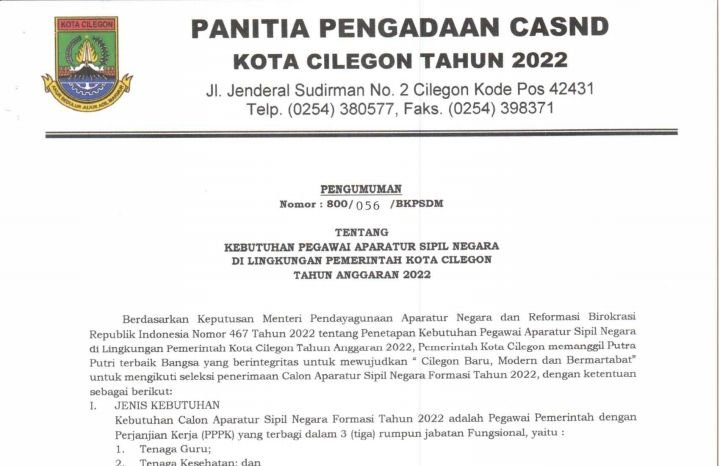 BANTENRAYA.COM – Berdasarkan pengumuman panitia pengadaan Calon Aparatur Sipil Negara (CASN) Kota Cilegon tahun 2022 nomor 800/ 056/ BKPSDM tentang Penetapan Kebutuhan Pegawai Aparatur Sipil Negara (ASN) di Lingkungan Pemerintah Kota Cilegon Tahun Anggaran 2022.
