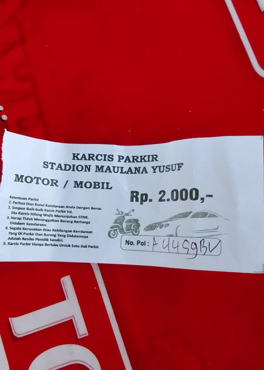 Karcis Parkir Stadion Maulana Yusuf. Pedagang Stadion Maulana Yusuf mengeluhkan adanya penarikan retribusi parkir kendaraan yang masuk Stadion MY. Kiriman warga