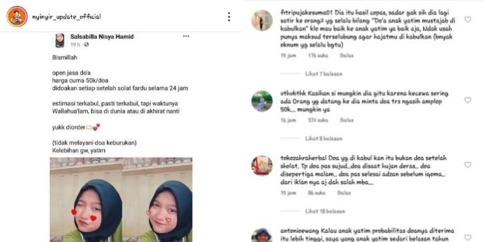 Dikutip Bantenraya.com dari akun Instagram @nyinyir_update_official, sebuah akun Facebook bernama Salsabilla Nisya Hamid adalah orang yang membuka jasa doa.