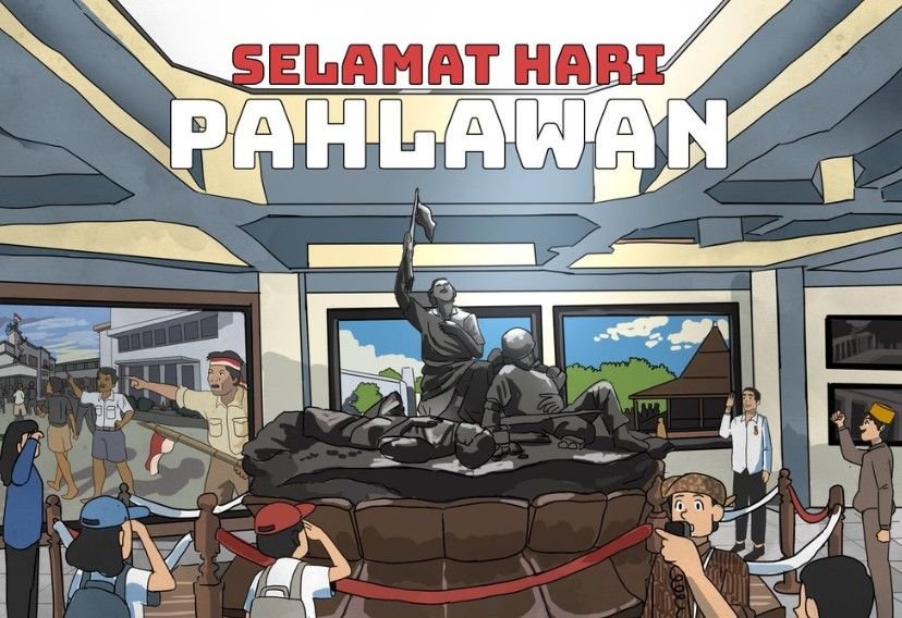Poster Hari Pahlawan 2022 tersebut terlihat seperti dalam museum, terdapat patung dan foto-foto perjuangan.