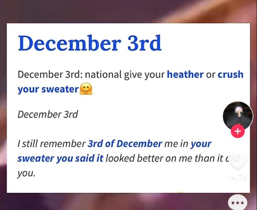 “Maksud dari sweater 3 Desember itu apa woy serius ini mah nanya,” tulis TikTok @grulll31_ pada keterangan unggahannya.
