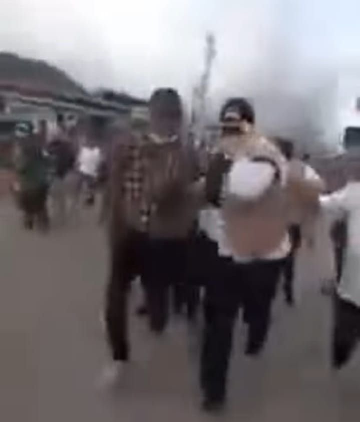 Dalam video terlihat, Cellica Nurrachadiaan diamankan oleh beberapa orang saat dilempari batu dan berlari menuju mobil.
