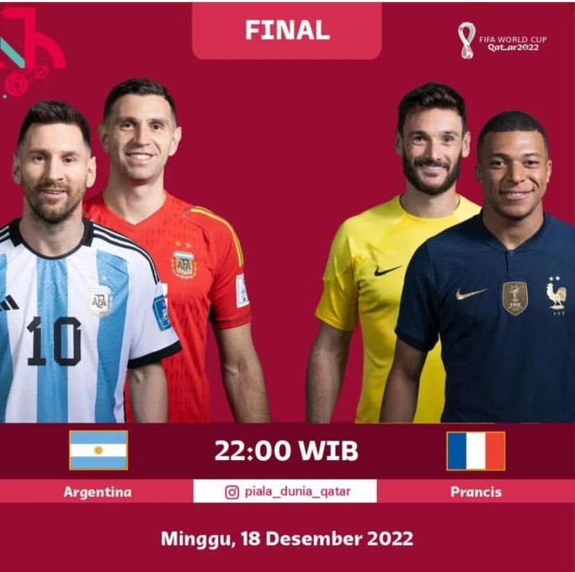 Pada laga Final Piala Dunia 2022 mempertemukan dua negara terkuat yaitu Argentina vs Perancis.