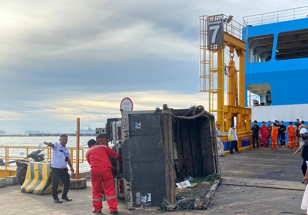 Akibat truk yang teguling, pelayanan di Dermaga 7 Pelabuhan Merak sempat dihentikan sementara.