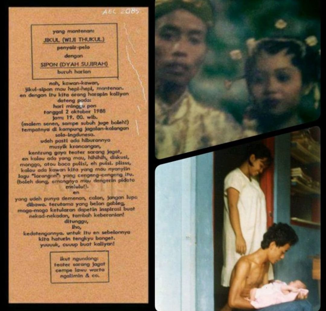“Dokumentasi ketika kangmas Thukul dan mbak Sipon menikah dengan undangan yang unik serta saat menimang bayi Fitri Nganthi Wani,” katanya yang juga menyelipkan foto keduanya saat jadi pengantgin dan menimang anak.