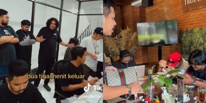 Terlihat Tretan Muslim mengatur karyawannya sambil memegang tas bermerk internasional dan jam mahal.