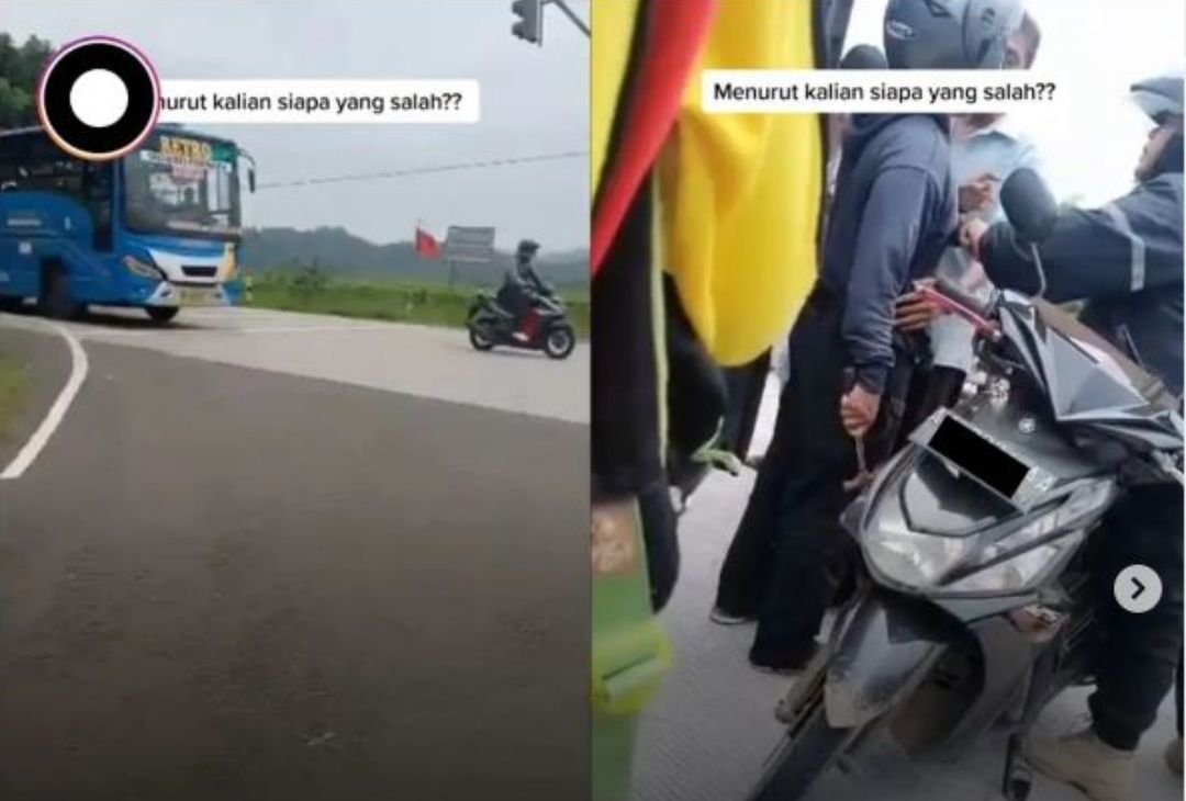 Untungnya laju bus tidak terlalu kencang sehingga masih bisa mengerem tepat waktu, begitu juga dengan pemotor.