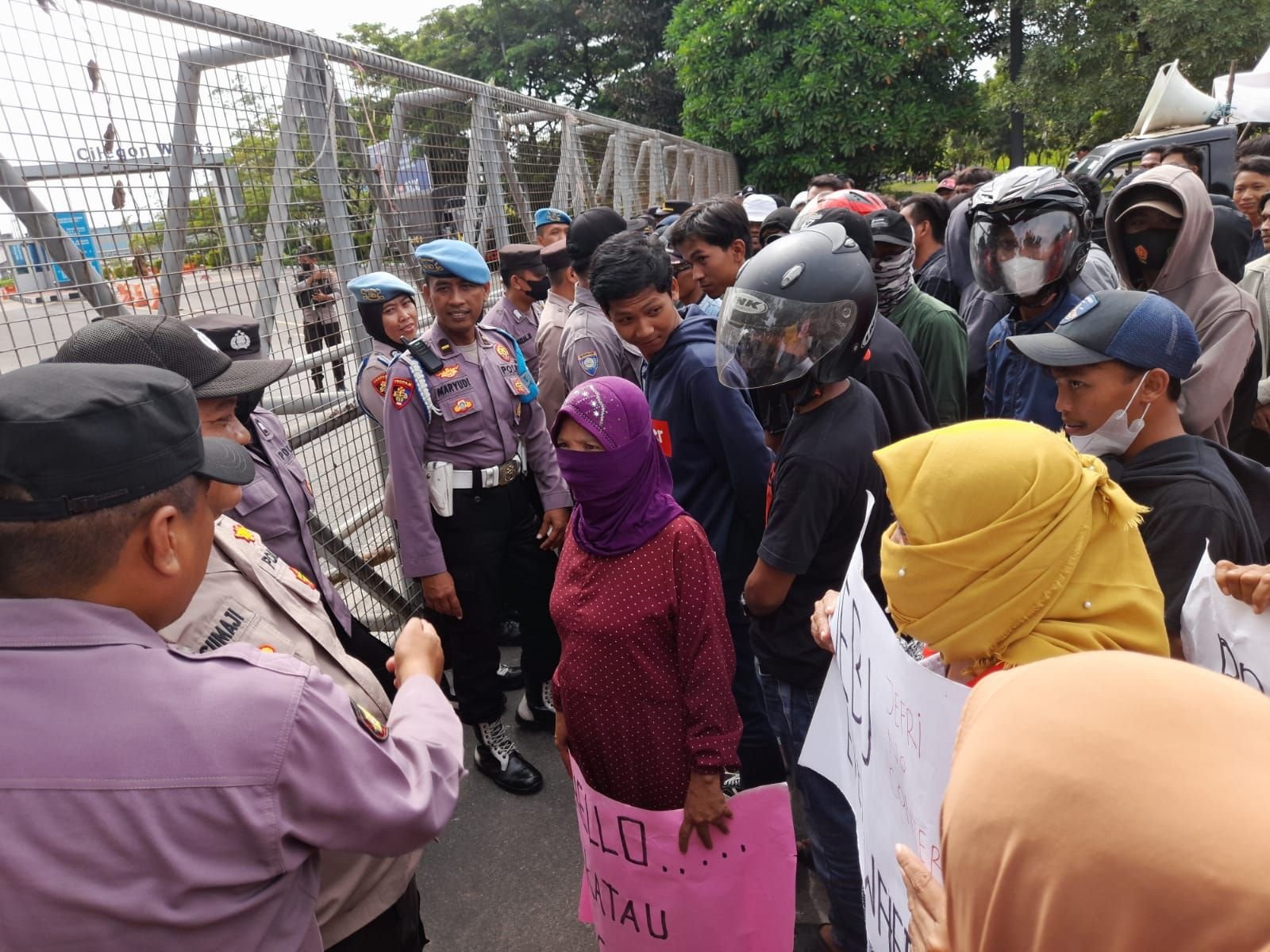 Para pendemo melakukan aksinya di dua pintu masuk PT Krakatau Posco.