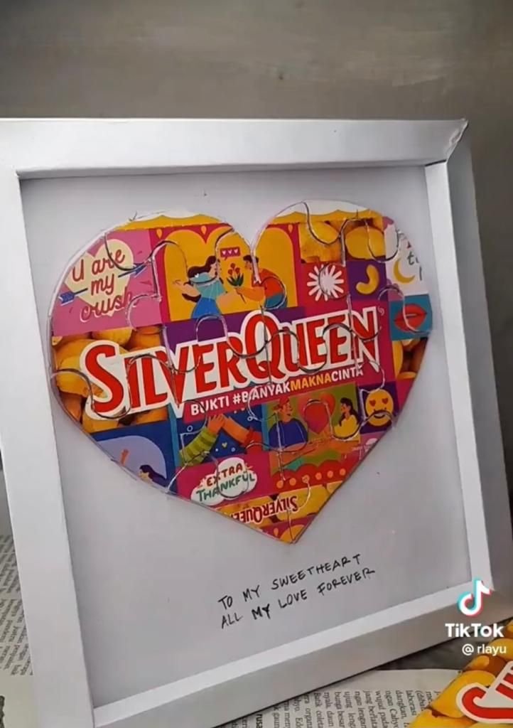Dari akun TikTok @rlayu, berikut cara membuat pigura bentuk puzzle love dari bungkus SilverQueen.