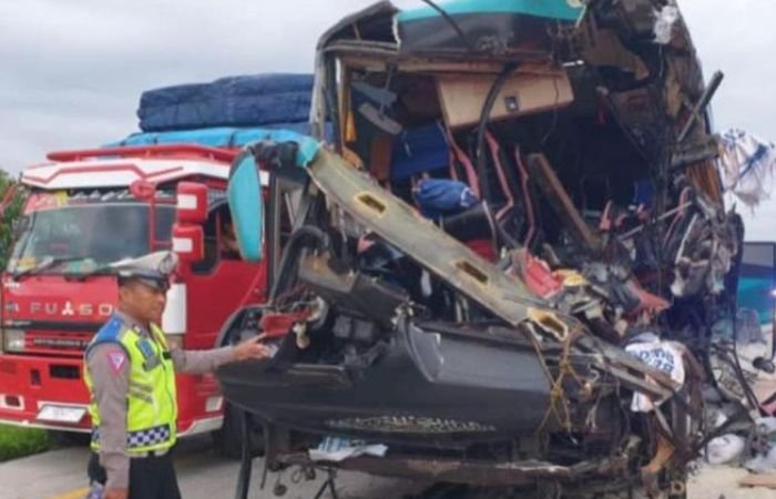 Bus Habibah Jaya Kencana menabrak bagian belakang truk dengan nomor polisi B 9038 FYT.