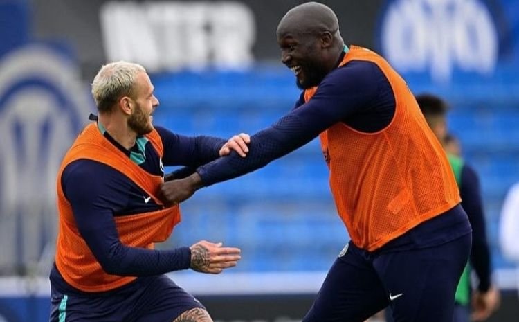 Pemain Inter Milan Romelu Lukaku (kanan) dan rekannya Dimarco saat fun game jelang melawat ke kandang Spezia dalam lanjutan Liga Seri A Italia musim ini. Instagram @inter