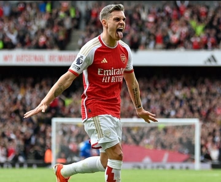 Pencetak gol ke-2 Arsenal, Leandro Trossard meluapkan kegembiraannya usai cetak go X/@Arsenal)