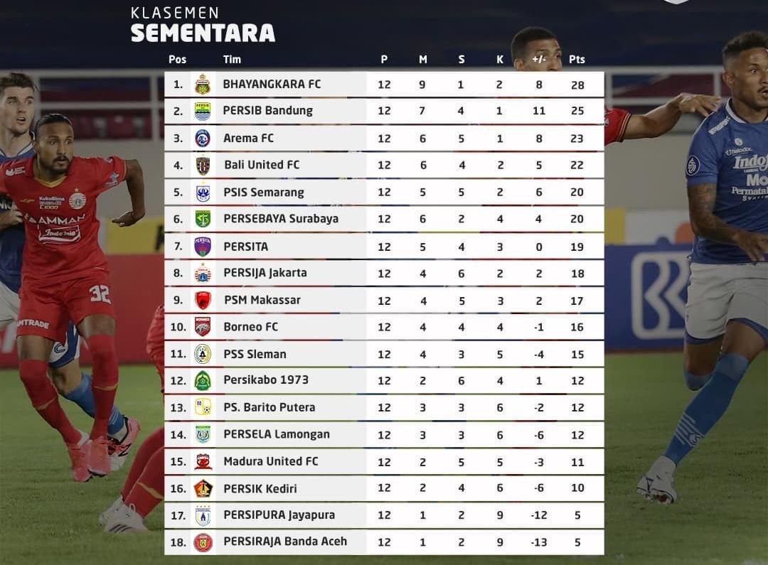 Sementara hasil pekan ke 12, masih menempatkan Bhayangkara FC sebagai pemuncak klasmen dengan poin 28.