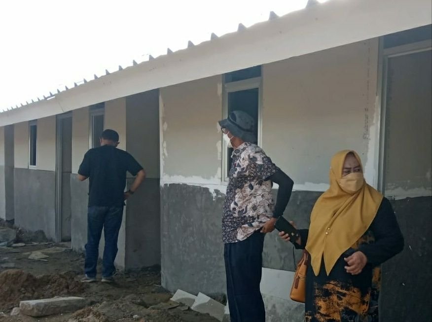 Kepala Seksi Rehabilitasi dan Rekonstruksi Badan Penanggulangan Bencana Daerah (BPBD) Pandeglang Lilis Sulistiati (kanan) saat meninjau progres huntap yang baru mencapai sekitar 60 persen, belum lama ini. Yanadi/Banten Raya