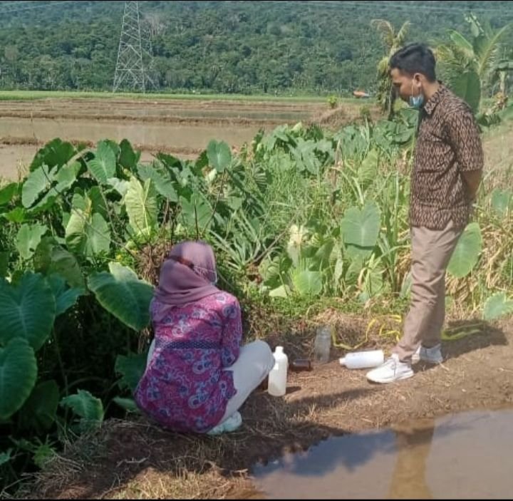 Petugas DLH Pandeglang mengambil sampel air limbah perusahaan tambak udang di Kampung Sambolo, Desa Pejamben, Kecamatan Carita belum lama ini. (yanadi/Bantenraya.com).