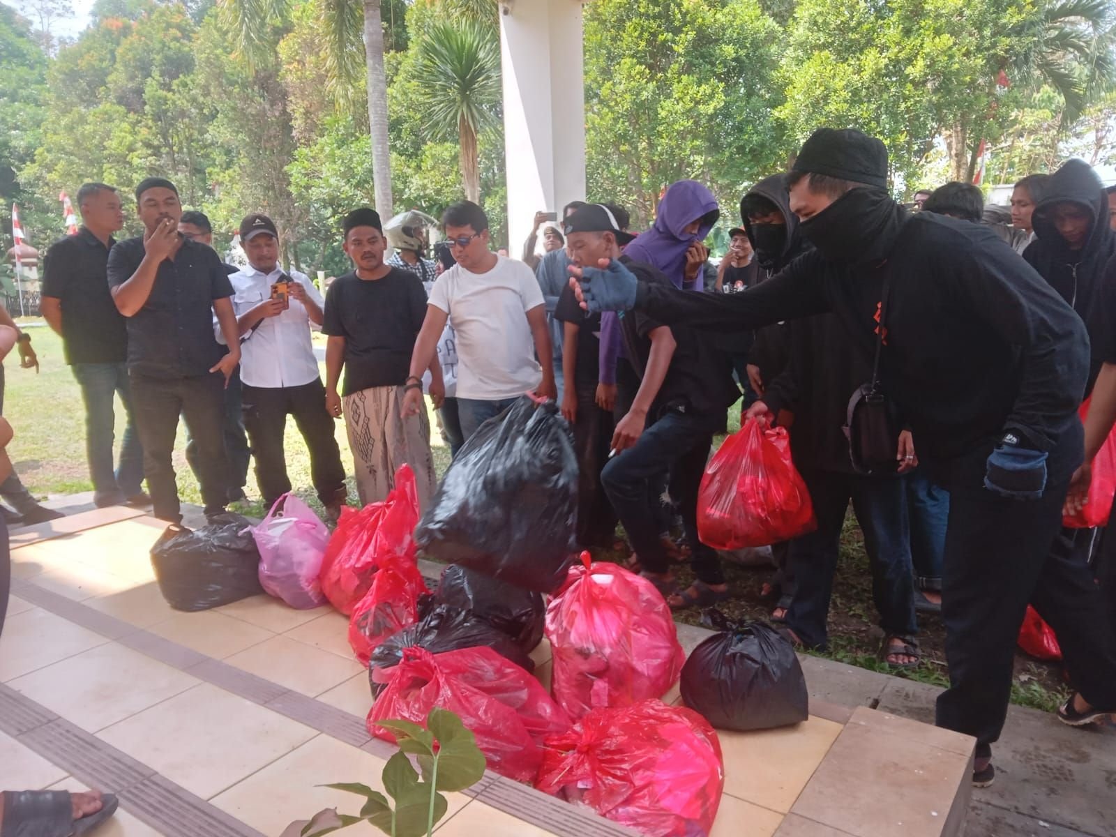 Dalam aksinya, kantor Setda Pandeglang juga dilempari sampah oleh sejumlah pemuda. Mereka ingin memberikan jika sampah mengeluarkan bau busuk. ***