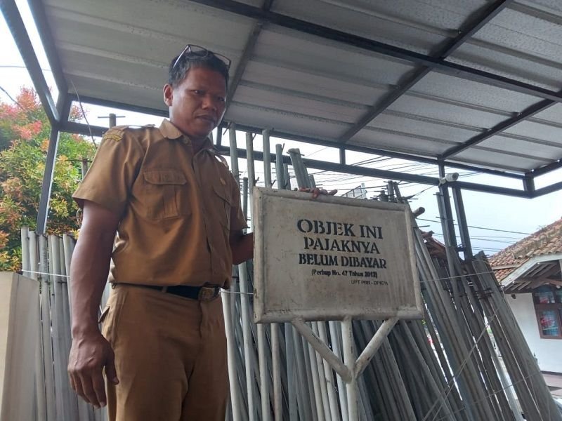 Kepala Bidang Penetapan pada Badan Pelayanan Pajak Daerah Kabupaten Pandeglang Muklis Arifin saat mengecek plang tunggak pajak, Selasa 2 November 2021. Yanadi/BantenRaya