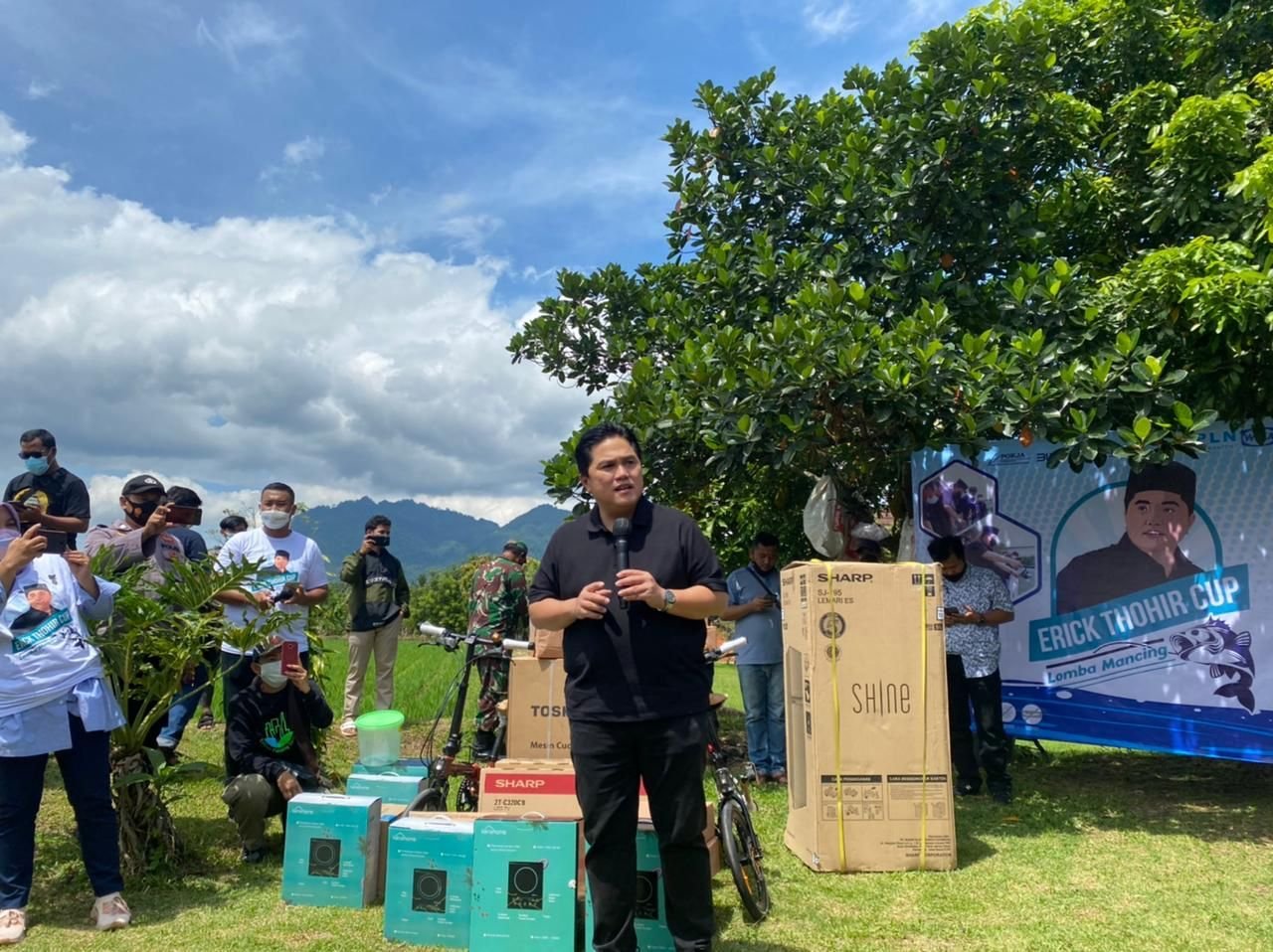 Menteri BUMN Erick Thohir saat sambutan dalam acara mancing bareng yang digagas Pokja Wartawan Harian dan Elektronik Provinsi Banten di Padarincang, Kabupaten Serang, Rabu 20 Oktober 2021. Acara ini merupakan sinergi antara PLN dan Pokja Wartawan Banten yang terselenggara dalam program Mancing Bareng HUT Provinsi Banten. PLN UID Banten