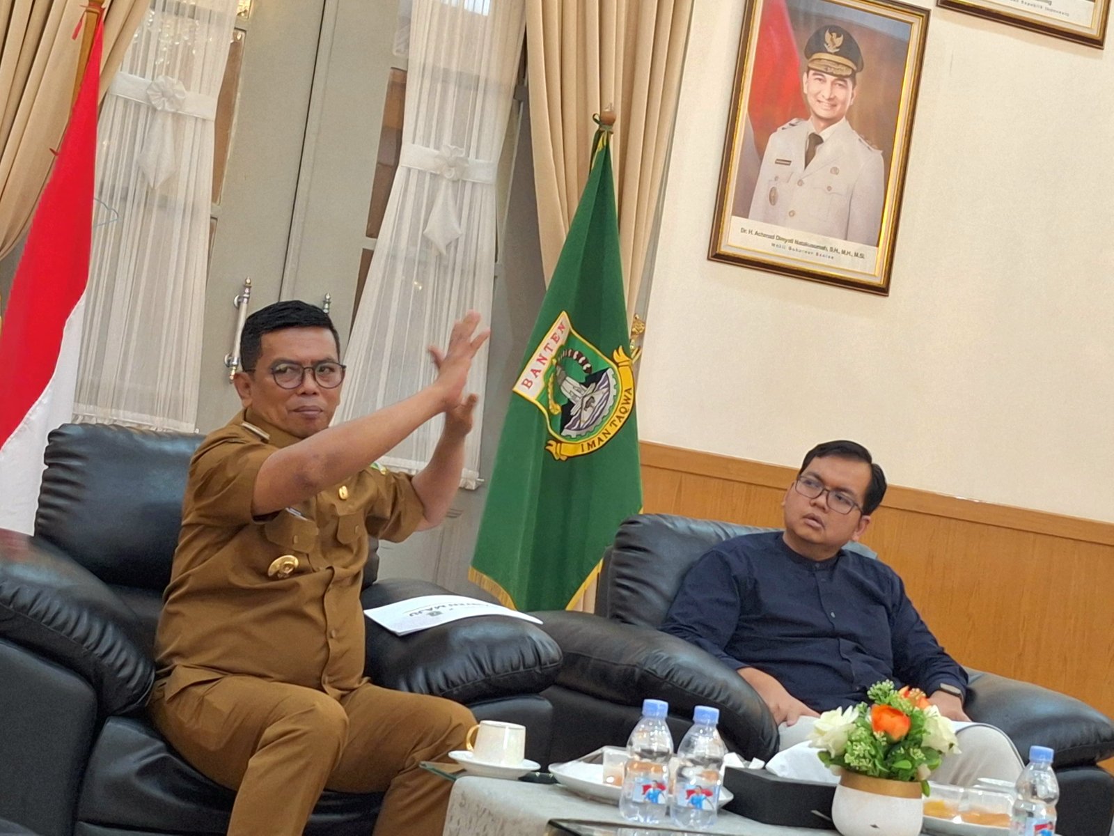 Gubernur Banten Andra Soni saat berbincang hangat dengan General Manager Banten Raya Fikri Hilman di Pendopo Lama Gubernur Banten. Senin, 23 Juni 2025. Raffi/Bantenraya.com
