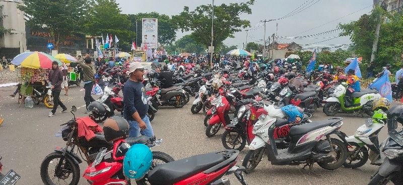 Dalam aksi demo tersebut, buruh memblokade empat jalur Jalan Syekh Nawawi Albantani depan KP3B.