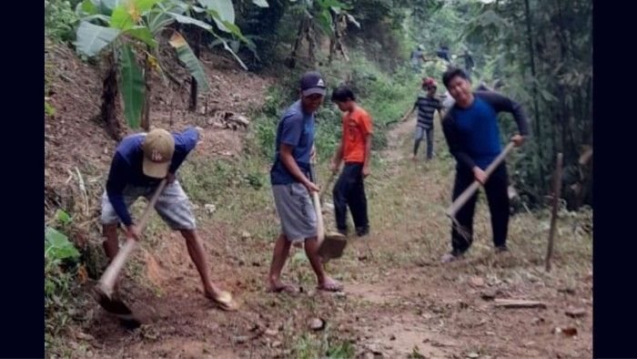 BANTEN RAYA – Warga Kampung Calung, Desa Pengarengan, Kecamatan Bojonegara, Kabupaten Serang memperbaiki sendiri atau swadaya jalan di kampung mereka yang sudah sulit dilewati.