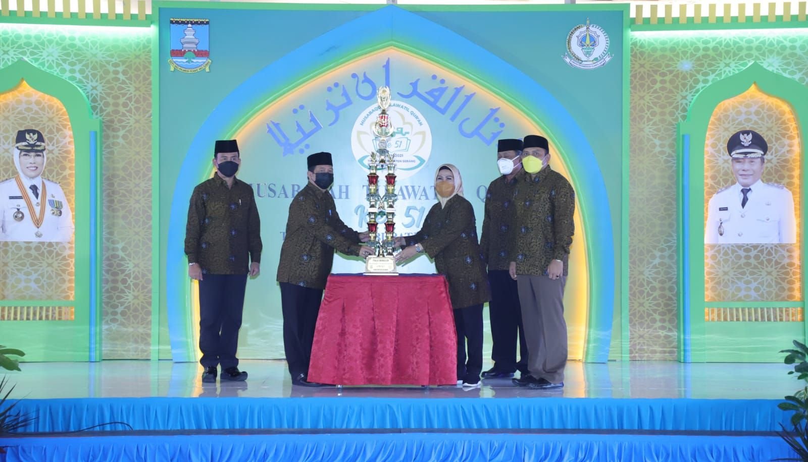 Bupati Serang Rt Tatu Chasanah menyerahkan piala bergilir kepada panitia saat pembukaan MTQ ke-51, Selasa 7 September 2021. Rahmat Tanjung Banten Raya