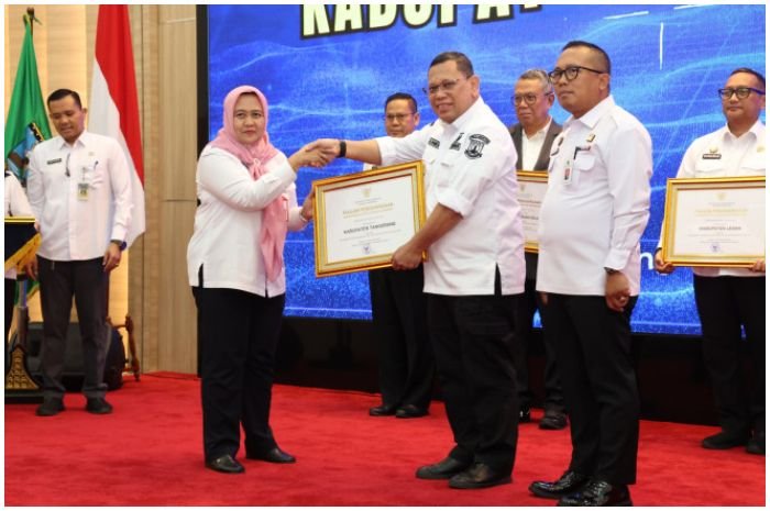 Penghargaan tersebut diserahkan langsung oleh Penjabat (Pj) Gubernur Banten, A Damenta, dan diterima oleh Staf Ahli Bupati Bidang Pemerintahan, Hukum, dan Politik, Prima Saras Puspa.