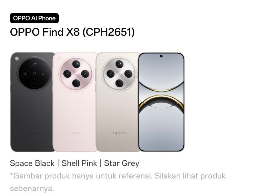 – Oppo Find X8 memiliki beberapa warna, yakni Space Black, Shell Pink, dan Star Grey.