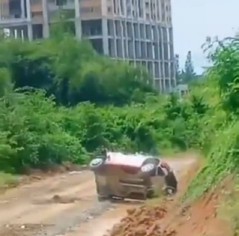 Salto sebanyak tiga kali, lalu mobil jatuh dalam posisi terbalik.