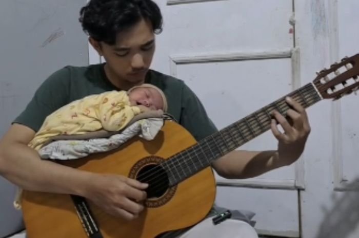 Dalam video tersebut, seorang ayah terlihat sedang memainkan gitar dengan sangat merdu sambil mengasuh anaknya yang tidur di atas gitar.
