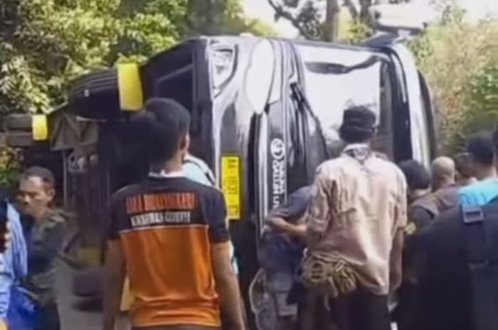 Bus syarat penumpang tersebut mengalami kecelakaan hingga terguling.
