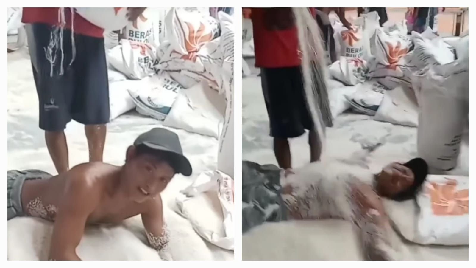 Pasalnya, pria yang tengah viral ini tengah asyik bermain di sebuah tumpukan beras Bulog.