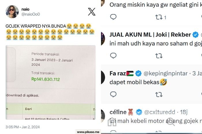 Pengunggahan hasil Gojek Wrapped ini dilakukan oleh akun X @pikaso_me pada tanggal 3 Januari 2024 lalu, menunjukkan hasil kinerja dan pengeluaran akun @naioOoO yang tak kalah fantastis.