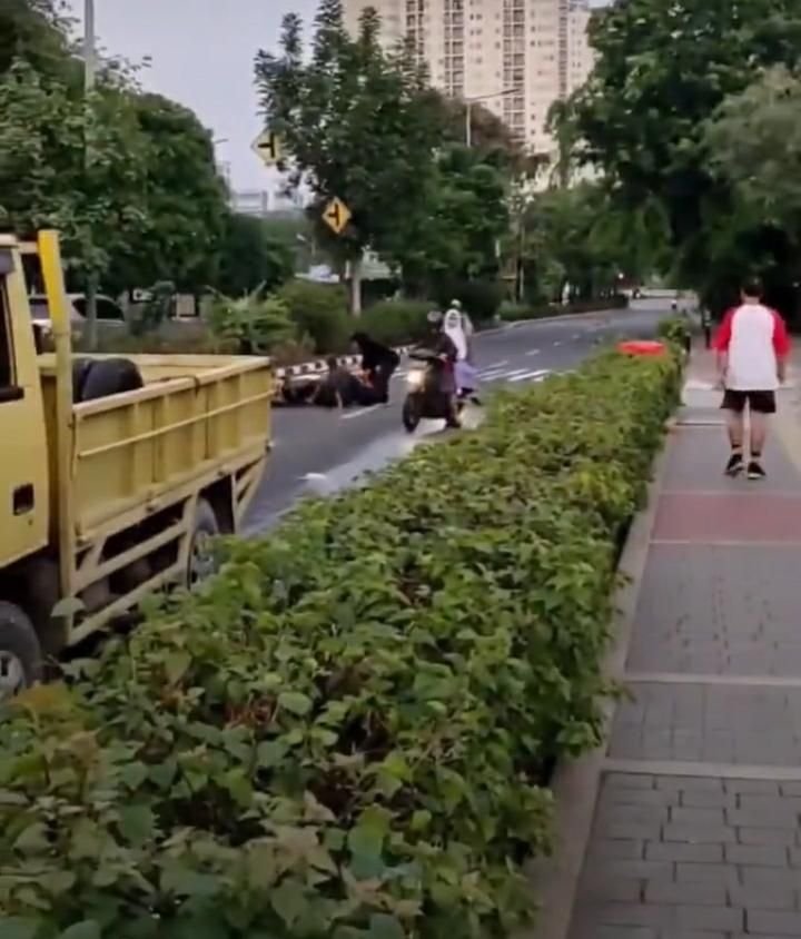 Lalu tak lama kemudian menyusul, pengendara motor 2 pria remaja seperti anak sekolah jatuh.